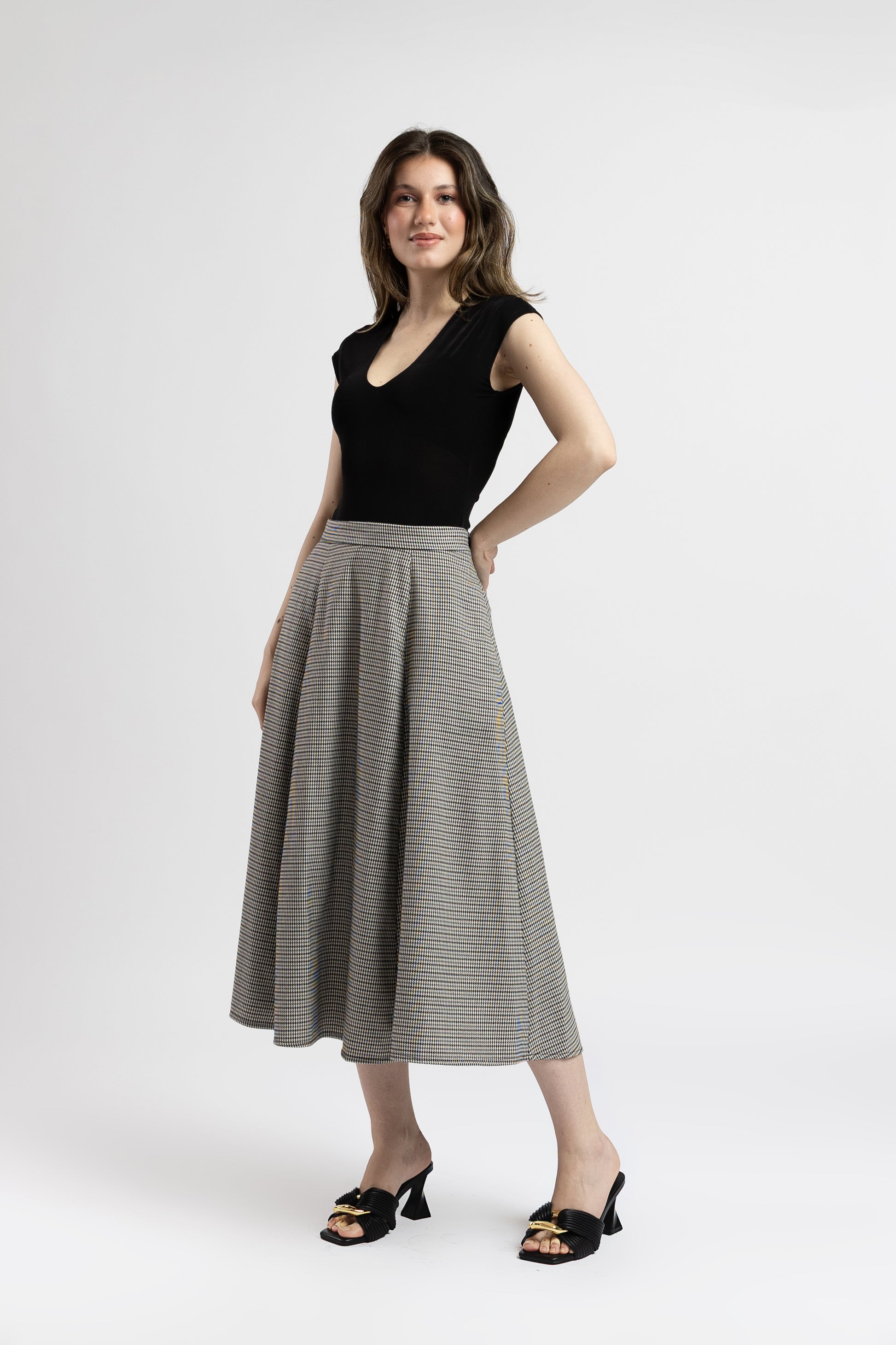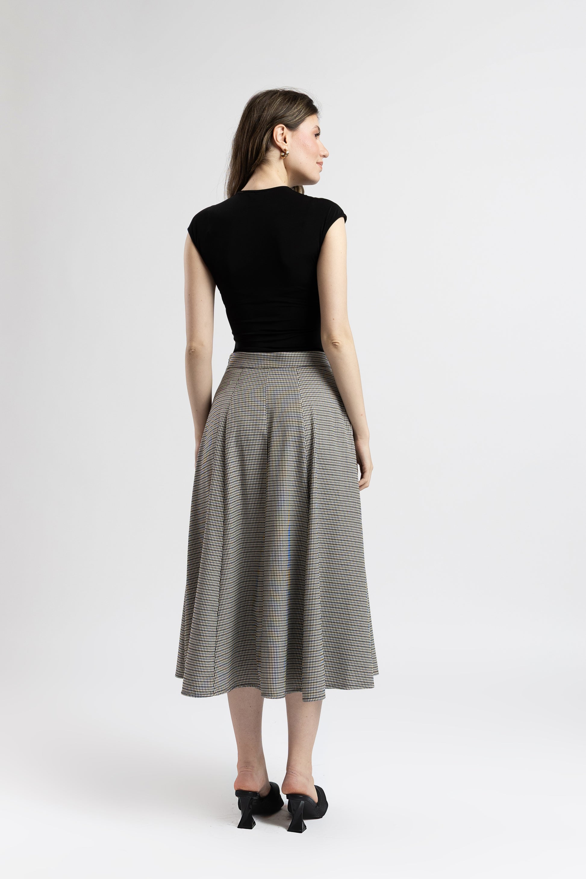 Această fustă midi este piesa de rezistență perfectă pentru o garderobă elegantă și practică în sezonul rece. Croiala cloș și imprimeul clasic în carouri fine conturează un look feminin, cu accente retro, ideal pentru zilele în care vrei să îmbini stilul cu confortul.