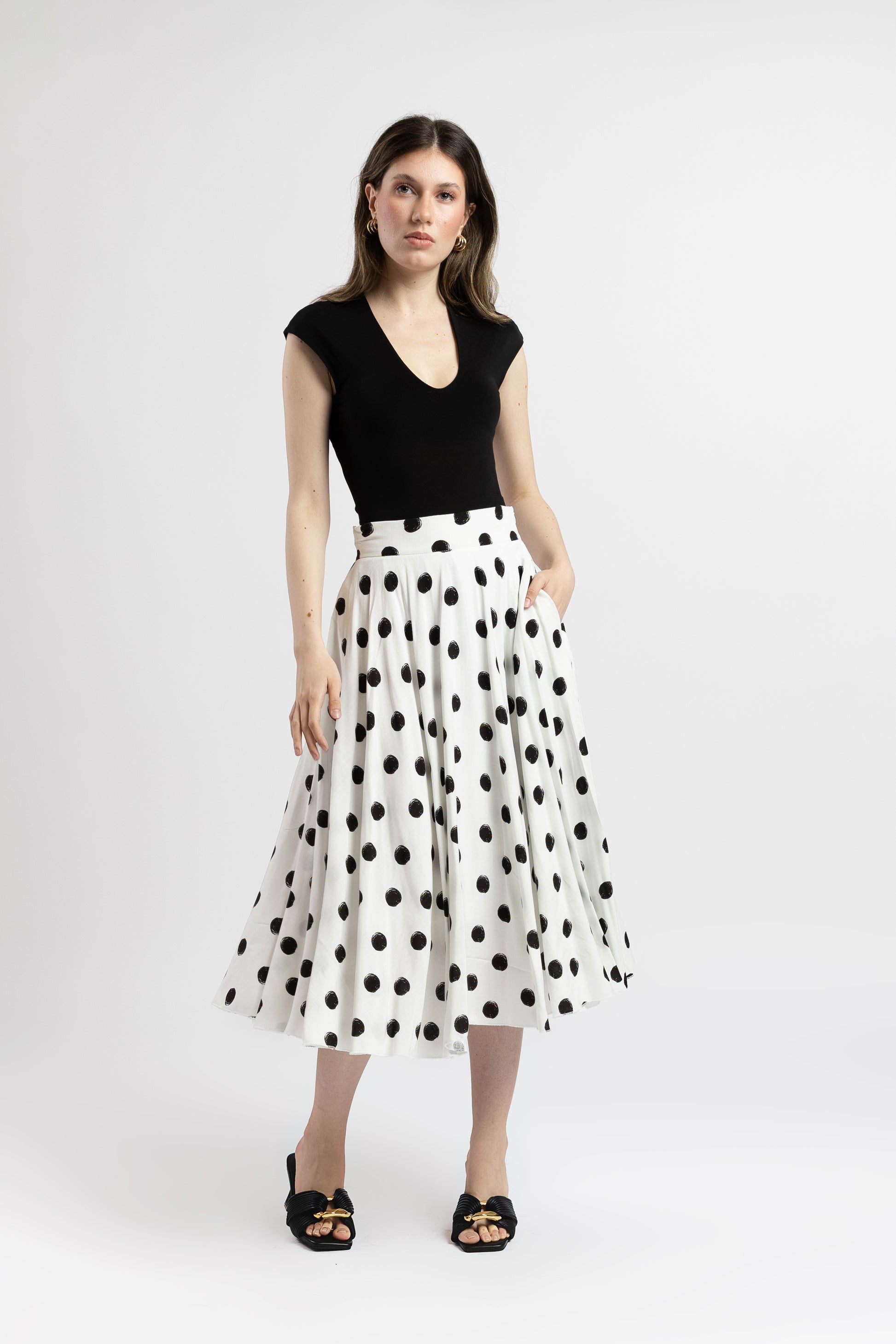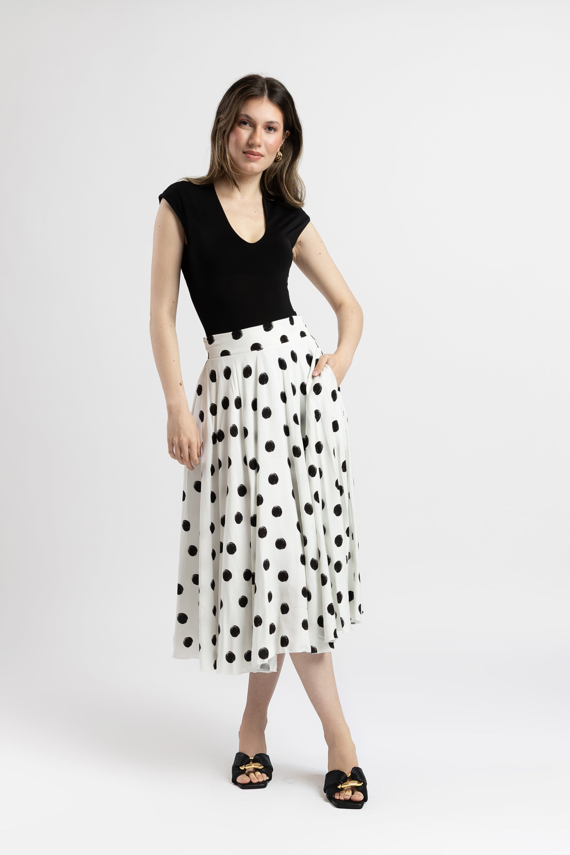 Fusta este o piesă vestimentară jucăușă și elegantă, ideală pentru zilele în care vrei să adaugi un plus de farmec ținutelor tale. Imprimeul clasic cu buline negre aduce un aer retro-chic, iar croiul amplu pune în valoare silueta într-un mod subtil și feminin.