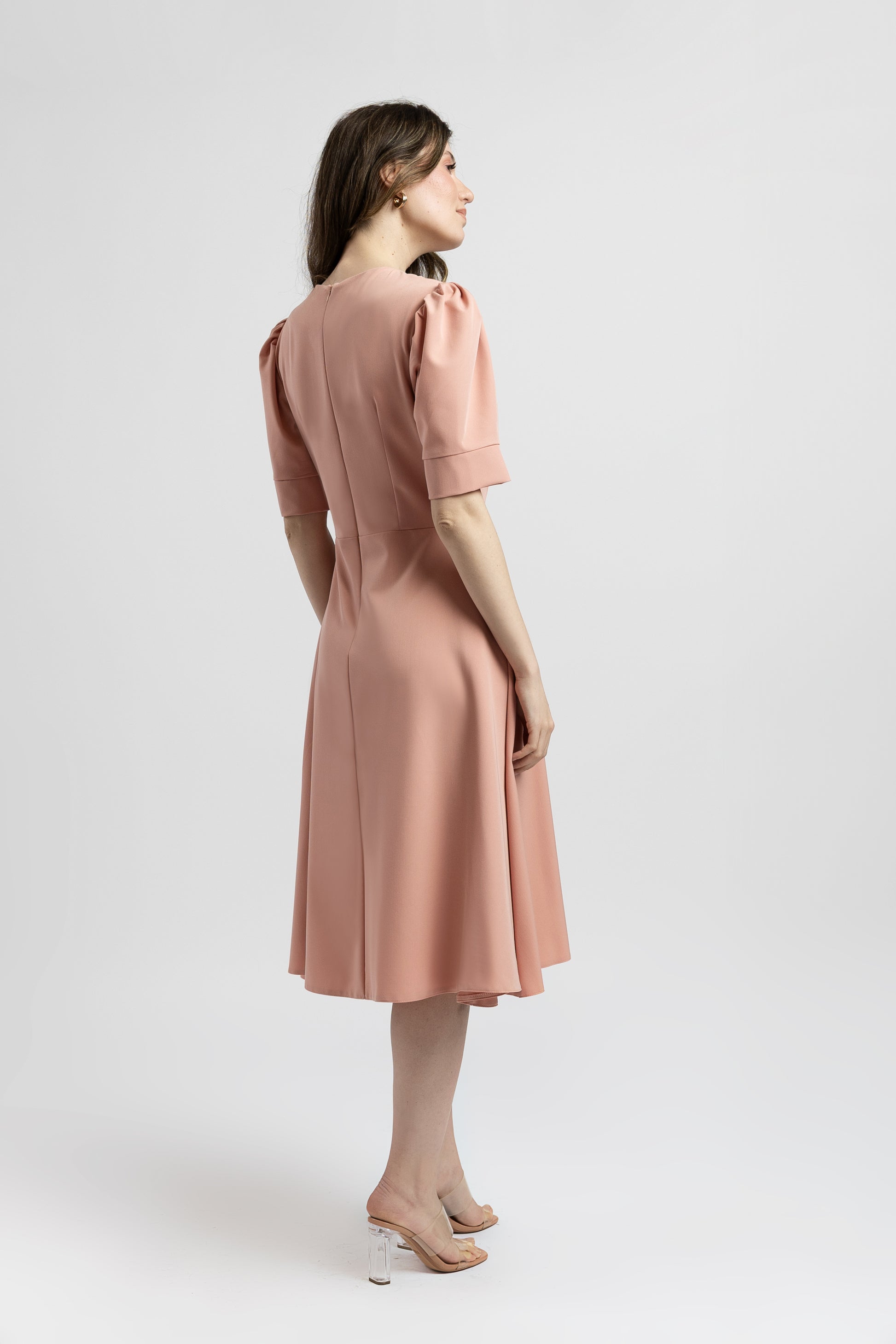 Această rochie midi este un omagiu adus eleganței atemporale, cu linii curate și detalii atent lucrate, perfecte pentru momentele în care vrei să te simți sofisticată fără efort. Croiala cambrată în talie pune în valoare silueta, în timp ce fusta amplă adaugă un aer fluid și feminin.