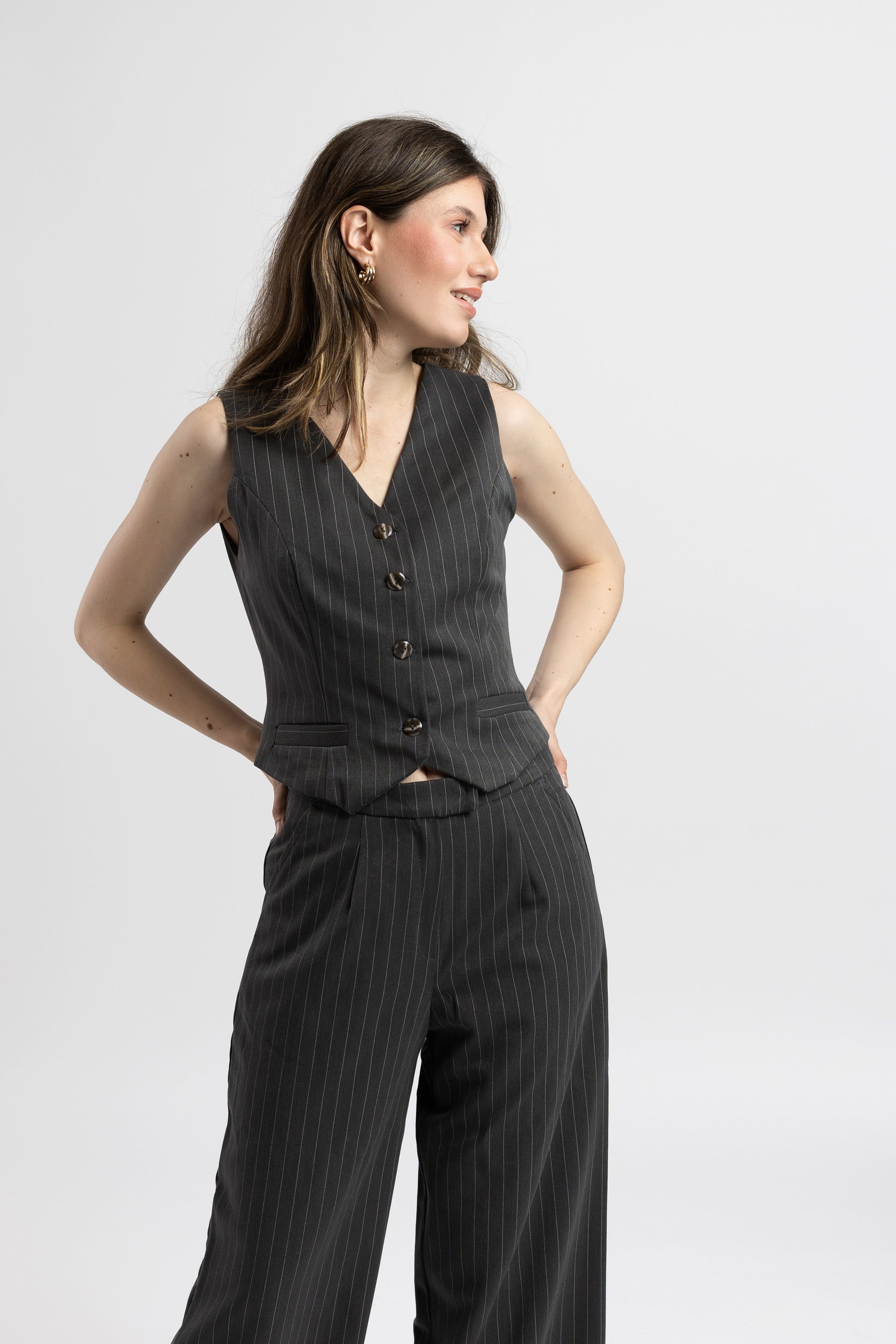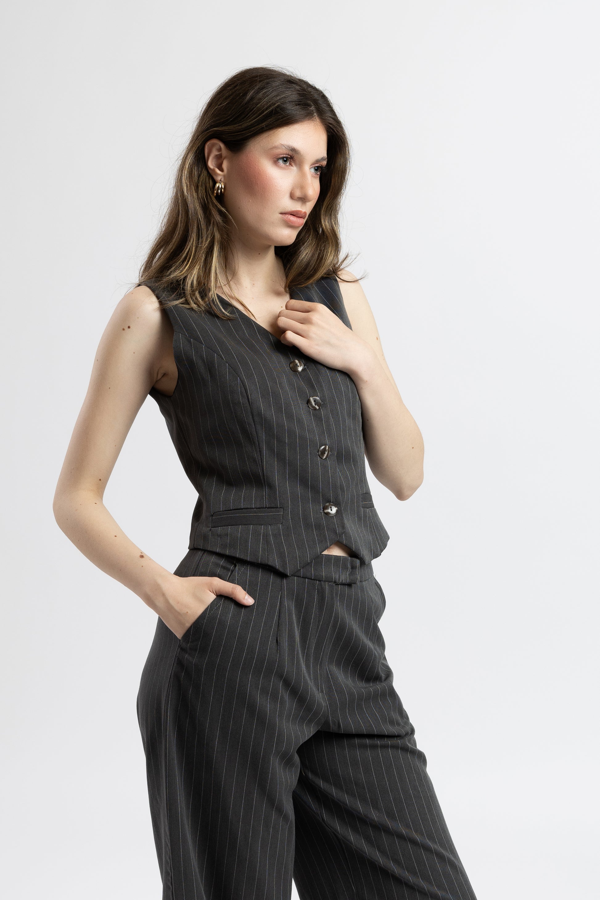Vestă Sharp Moves este piesa care adaugă un plus de rafinament oricărei ținute. Cu o croială structurată și nasturi eleganți, această vestă se remarcă prin versatilitate și ușurința cu care poate fi integrată într-un look de zi sau de seară.